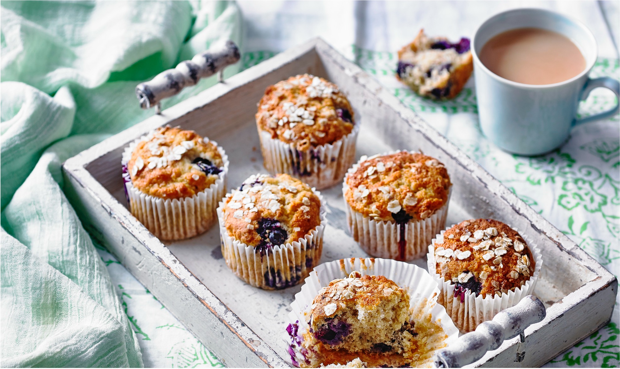 - Verdeel het mengsel over siliconen cupcake- of muffinvormpjes en versier met de resterende havermoutvlokken.